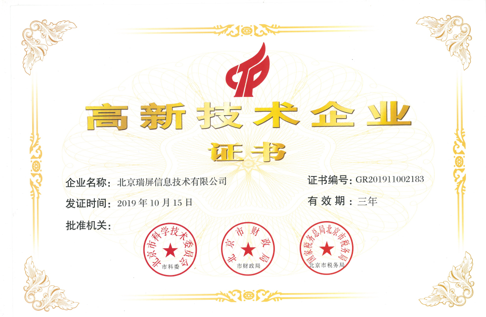 瑞屏信息 获得国家高新技术企业认证
